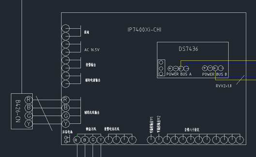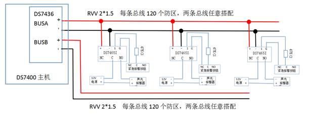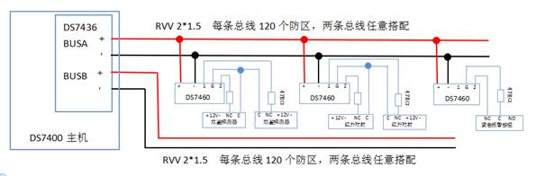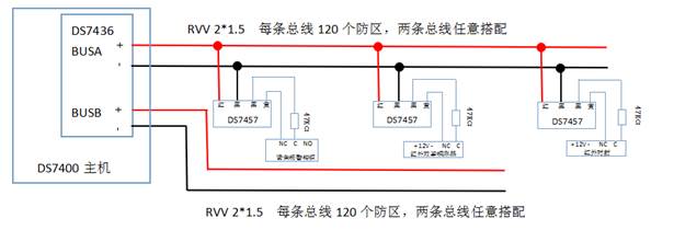 擴(kuò)展防區(qū)則需要增加雙回路總線驅(qū)動(dòng)器(DS7436),擴(kuò)展防區(qū)都接在兩條總線上