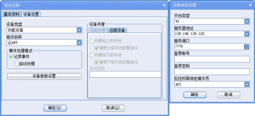 設(shè)備類(lèi)型:功能設(shè)備,設(shè)備名稱(chēng):云APP,點(diǎn)擊【設(shè)備參數(shù)設(shè)置】