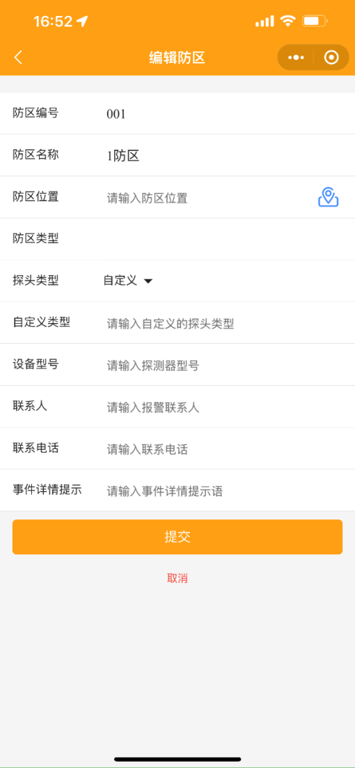2.3 設(shè)置防區(qū)信息:可編輯防區(qū)位置、探頭類(lèi)型、自定義類(lèi)型、設(shè)備型號(hào)、聯(lián)系人、聯(lián)系電話、事件詳情提示。點(diǎn)擊防區(qū)位置右側(cè)圖標(biāo)可設(shè)置防區(qū)定位。防區(qū)編號(hào)、防區(qū)名稱(chēng)、防區(qū)類(lèi)型需通過(guò)PC端集成平臺(tái)修改后同步。