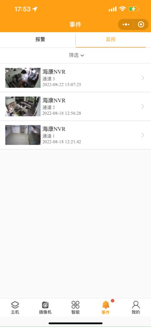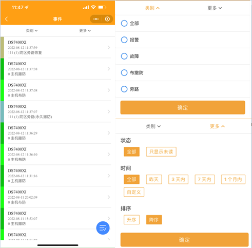 2.7 查詢事件:點(diǎn)擊事件按鈕進(jìn)入事件界面,點(diǎn)擊類(lèi)別和更多可按警情和時(shí)間分類(lèi)查詢事件。點(diǎn)擊藍(lán)色按鈕把事件全部標(biāo)記為已讀。