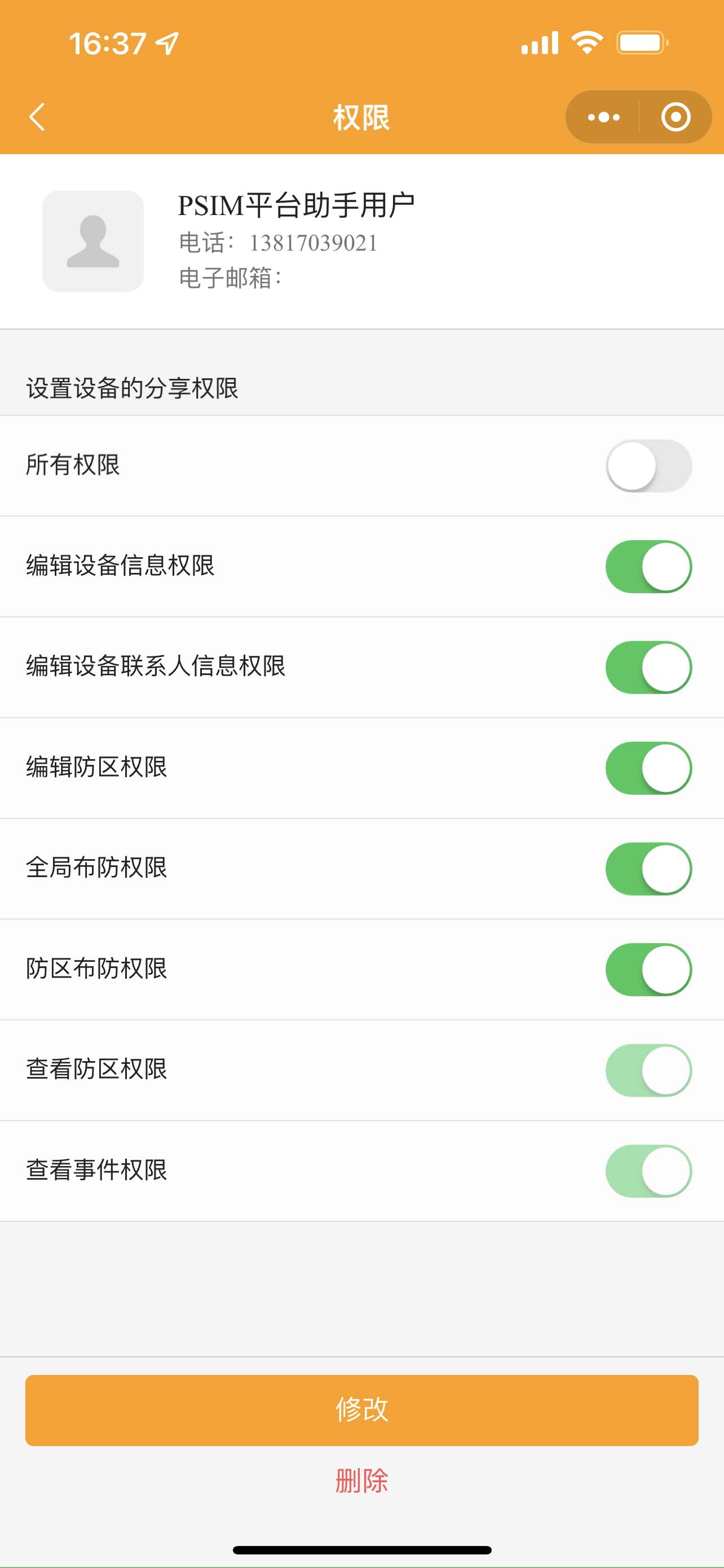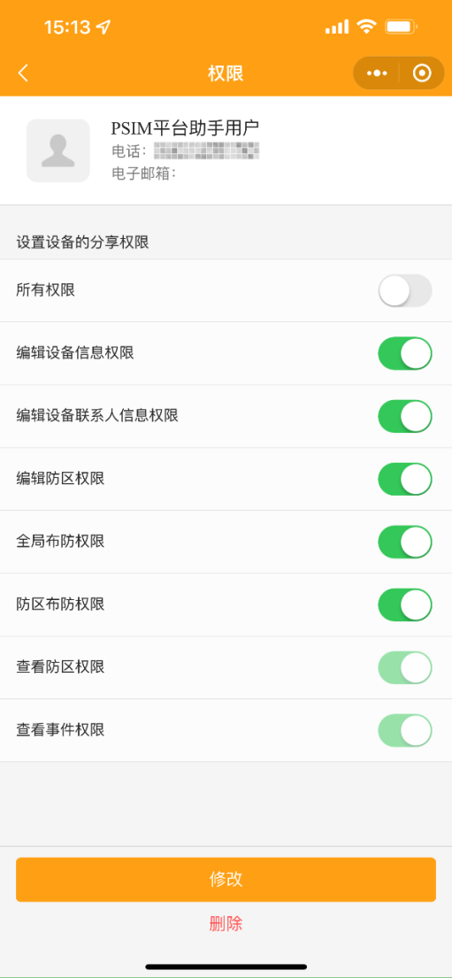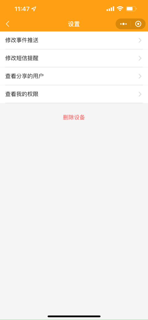 1. 設(shè)置:可修改事件推送、修改短信提醒、查看分享用戶、查看我的權(quán)限、刪除設(shè)備操作。