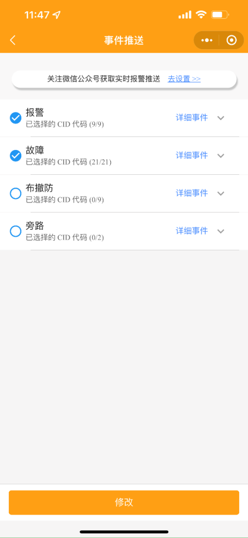 1.1 修改事件推送:勾選需要推送的事件類(lèi)型,點(diǎn)擊修改確認(rèn)。點(diǎn)擊【去設(shè)置】關(guān)注微信公眾號(hào)“5G智聯(lián)運(yùn)維助手”,獲取設(shè)備報(bào)警推送信息。