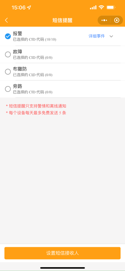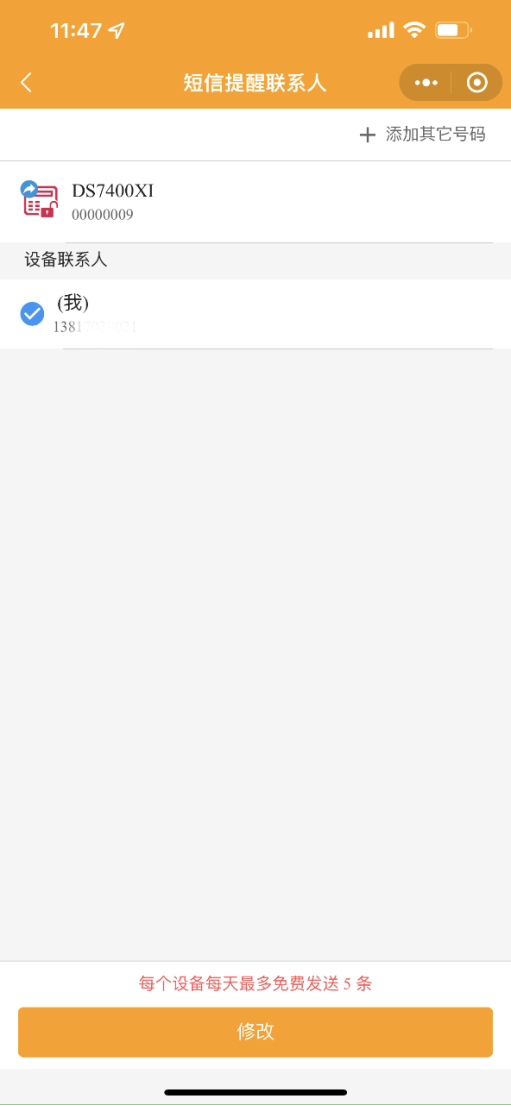 1.2 修改短信提醒:短信提醒只支持警情和離線通知,每個(gè)設(shè)備每天最多免費(fèi)發(fā)送5條,可添加多個(gè)號(hào)碼設(shè)置推送。