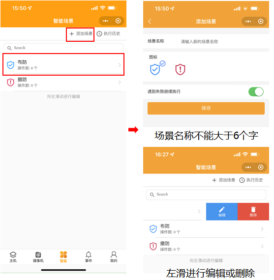 1.5 智能場(chǎng)景:智能界面設(shè)置快捷方式,點(diǎn)擊【添加場(chǎng)景】輸入場(chǎng)景名稱(chēng)選擇圖標(biāo)添加操作按鈕。點(diǎn)擊布防場(chǎng)景圖標(biāo),進(jìn)行添加操作。