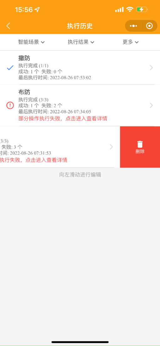 點(diǎn)擊執(zhí)行歷史按鈕,可通過(guò)智能場(chǎng)景、執(zhí)行結(jié)果、更多選項(xiàng)查詢。點(diǎn)擊進(jìn)入查看詳情,左滑可刪除記錄。