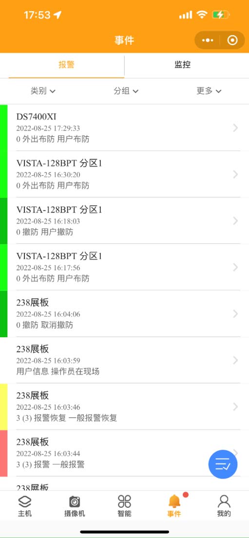 2. 事件:事件界面分為報(bào)警和監(jiān)控。可按類(lèi)別、分組、更多等方式查詢報(bào)警事件。