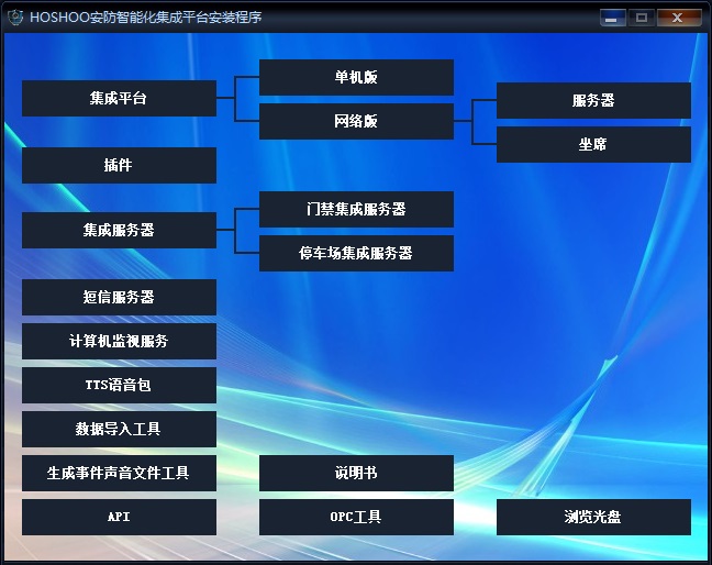 將安裝光盤放入光驅內,雙擊運行光盤目錄下的Autorun.exe,將彈出HOSHOO安防智能化集成平臺安裝程序界面,彈出下圖: