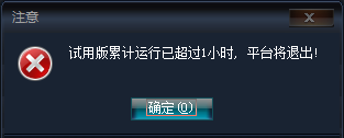 試用版平臺,只允許連續(xù)運行1個小時,運行1個小時后,將彈進試用版超時提示框,如下圖:
