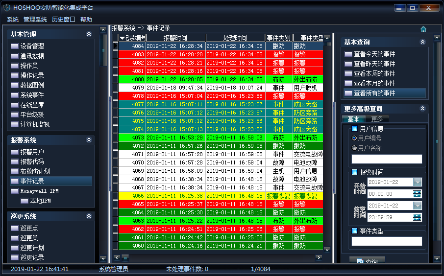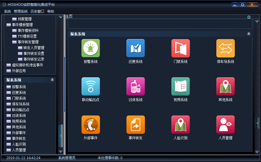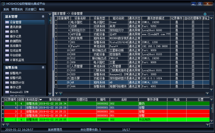 事件欄:平臺接收新事件的顯示區(qū)域,該處顯示未處理事件。事件處理在這里進行,處理后,將從這里刪除,將進入歷史數(shù)據(jù)。