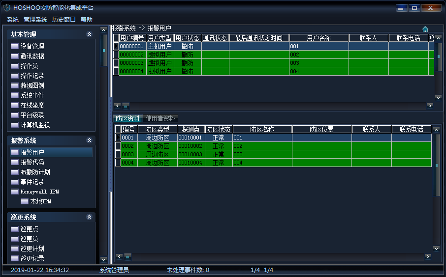 在平臺軟件中操作面板里的報警系統(tǒng)面板組上,點擊【報警用戶】,功能區(qū)將顯示報警用戶數(shù)據(jù)網格,如下圖: