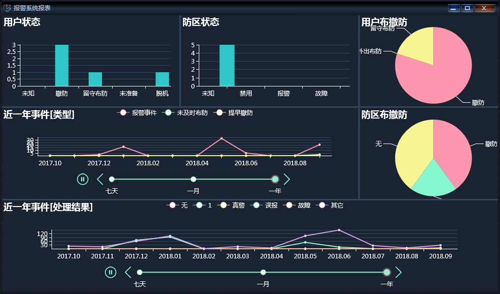 在平臺軟件中操作面板里的報表系統(tǒng)面板組上,點擊相應的報表,如【報警系統(tǒng)】,將彈出相應的報表窗口,如下圖: