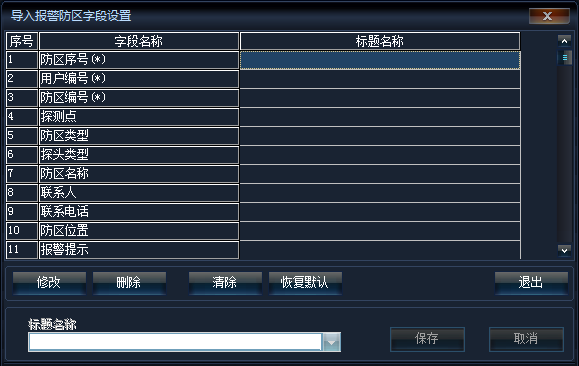 以報警防區(qū)資料導入為例,首先在【選擇數(shù)據(jù)資料】中選擇警報防區(qū),點擊【讀報警防區(qū)】按鈕選擇要導入的Excel數(shù)據(jù),點擊【字段設置】按鈕,顯示如下圖: